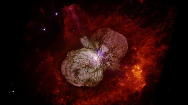 Era Carinae tem sido, depois do Sol, a estrela a mais observada (por telescópios), fotografada e estudada do universo – ao menos pelos humanos. Eta Carinae, estrela mais luminosa da Via Láctea, perderá nuvem de poeira que hoje ofusca seu brilho quando vista da Terra. Nasa/Nathan Smith/Berkeley Apesar de brilhar com a intensidade de cinco milhões de sóis, a estrela conhecida mais luminosa da Via Láctea, Eta Carinae, localizada a 7,5 mil anos-luz do Sistema Solar, não é visível a olho nu da Terra. Isso não vai durar para sempre, no entanto. Um estudo de um grupo internacional de pesquisadores, liderados pelo astrônomo brasileiro Augusto Damineli, da Universidade de São Paulo (USP), indica que em breve, em pouco mais de 10 anos, a nuvem de poeira e gás que a esconde dos olhos nus dos terráqueos terá se dissipado e ela poderá ser vista em todo o seu brilho. Sua luz se tornará duas vezes e meia maior do que atualmente é visível por telescópios. A Era Carinae tem sido, depois do Sol, a estrela a mais observada (por telescópios), fotografada e estudada do universo – ao menos pelos humanos. Mas também é uma das mais intrigantes e misteriosas. Muito jovem, com apenas 2,5 milhões de idade, ou cerca 1,8 mil vezes mais nova que o Sol, ela é uma supergigante da raríssima classe das luminosas azuis (que têm uma temperatura mais quente), das quais se conhece apenas algumas dezenas. Situada na constelação austral de Carina, à direita do Cruzeiro do Sul, Eta Carinae foi catalogada, em 1677, pelo astrônomo e matemático britânico Edmond Halley (1656-1742), famoso por ser o primeiro observador da órbita do cometa que que leva seu nome. Mas ela começou a chamar realmente a atenção em 1843, quando uma grande erupção lançou ao espaço matéria sua equivalente à massa de dezenas de sóis. Como consequência do evento, seu brilho aumentou tanto que durante meses ficou visível durante o dia da Terra. Em contrapartida, criou-se uma nebulosa em torno dela, com o formato de uma ampulheta ou lóbulos, chamada de Homúnculo, com 3 trilhões de quilômetros (4 meses-luz) de uma ponta a outra, que, junto com nuvens poeira e gases, lançadas durante a mesma explosão, ofusca seu brilho em direção ao nosso planeta. Além desta, houve pelo menos duas outras erupções menores conhecidas, uma vista em 1250 e outra em 1890. Desde então, muito se aprendeu sobre esse astro. Grande parte das descobertas recentes se deve a Damineli, do Instituto de Astronomia, Geofísica e Ciências Atmosféricas (IAG) da USP, autor principal do novo estudo, que se dedica a estudar Eta Carinae há cerca de 30 anos. Entre elas, a de que esta estrela é um sistema duplo, composto por dois astros. Imagens de raio x da estrela dão pistas sobre seu comportamento Nasa Ele descobriu que a cada 5,5 anos a estrela sofre um pequeno "apagão" para quem a observa da Terra. Damineli concluiu que isso deve ocorrer porque o sistema é duplo e uma das estrelas, a menor, passa na frente da outra. Hoje, isso é um fato aceito por todos. De acordo com ele, a estrela menor tem 30 vezes a massa do Sol e a maior, 90. "Se fosse colocada no lugar da nossa estrela, a superfície desta última estaria além da órbita da Terra, entre nosso planeta e Marte", diz. "Ela brilha escondida atrás da poeira com uma potência de 5 milhões de sóis, o que está no limite teórico, um pouco mais que isso, ela evaporaria", explica Damineli. "Nos últimos 20 anos, astrônomos detectaram um aumento do brilho da Eta Carinae, que se fosse dela mesmo já teria ultrapassado esse limite. Com isso, surgiu a hipótese de que ela explodiria dentro de algumas décadas." No novo trabalho, ele conclui que não é isso que está acontecendo com a estrela. Para chegar a esse resultado, Damineli coordenou uma equipe de 17 pesquisadores do Brasil, Argentina, Alemanha, Canadá, e Estados Unidos, que analisou todos os dados de observação disponíveis sobre Eta Carinae dos últimos 80 anos. "Eles vem de mais de 60 mil observações, a maioria feita por estudantes de Astronomia no telescópio da Universidade Nacional de La Plata, na Argentina, entre 2003 e 2015", conta. "Elas foram comparadas com os dados do telescópio espacial Hubble, que corrigiram as distorções das observações do solo e proporcionaram imagens de qualidade excepcional da estrela, separando-a da nebulosa do Homúnculo que a cerca." No artigo, publicado na revista científica Monthly Notices of the Royal Astronomical Society em 4 de janeiro, Damineli e seus colaboradores propõem que o aumento de brilho de Eta Carinae não é intrínseco a ela como muitos pesquisadores imaginaram, mas é causado pela dissipação de uma nuvem de poeira posicionada exatamente na frente dela, em direção à Terra. O estudo revelou que, além de três nuvens de gás (chamados glóbulos de Weigelt) existe uma quarta. "Ela cobre completamente a estrela e seus ventos, apagando a maior parte de sua luz viajando em nossa direção", explica o professor da USP. "Uma das outras três se desfez recentemente, um indício de que o mesmo deverá acontecer com a que tapa nossa visão." Escondendo a nebulosa Apesar dessa nuvem de poeira, a Nebulosa do Homúnculo pode ser vista diretamente, pois é 200 vezes maior do que ela e seu brilho quase não é afetado. Mas isso também vai acabar em breve. "Em 2032, ou quatro anos a mais ou a menos, a poeira terá desaparecido e o brilho aparente da estrela não aumentará mais, mas ofuscará a nebulosa", diz Damineli. "Ou seja, em poucos anos, perderemos a oportunidade de tirar belas fotos do Homúnculo, mas veremos mais claramente o par de estrelas gêmeas dentro. Os apagões periódicos também poderão ser visto com mais clareza." Sem a nuvem, o brilho de Eta Carinae visto da Terra será semelhante ao da estrela chamada Intrometida, da constelação do Cruzeiro do Sul. "Por mais de meio século os cientistas acreditaram que a Eta Carinae era malcomportada, cheia de 