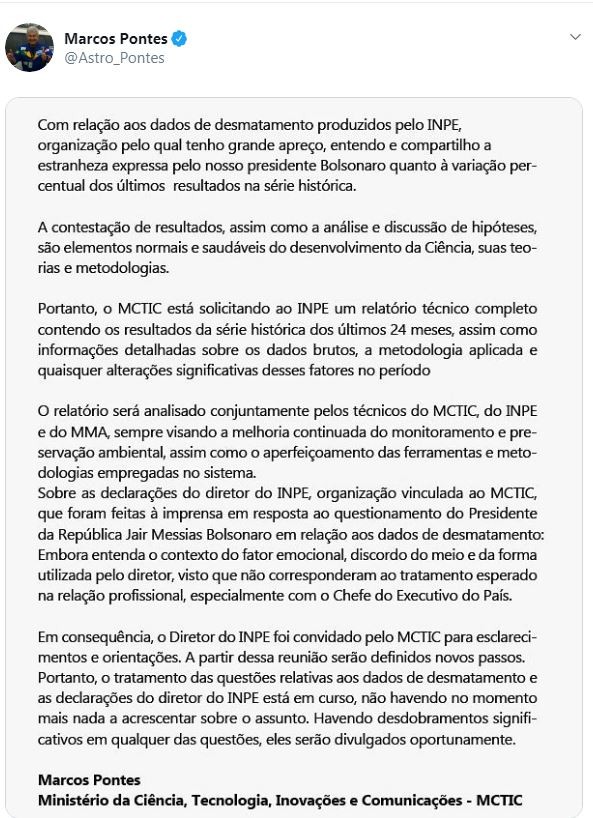 'Com toda a devastação que vocês nos acusam de estar fazendo e de ter feito no passado, a Amazônia já teria se extinguido', afirmou o presidente, que também acusou o diretor do Inpe de estar 'a serviço de alguma ONG'. O diretor nega. O ministro da Ciência e Tecnologia (MCTIC), Marcos Pontes, divulgou uma nota nesta segunda-feira (22) informando que está solicitando ao Instituto Nacional de Pesquisas Espaciais (Inpe) dados consolidados sobre o desmatamento da Amazônia nos últimos 24 meses. Pontes também afirma que o diretor do instituto, Ricardo Galvão, foi convidado para "esclarecimentos e orientações". Na última sexta-feira (19), o presidente Jair Bolsonaro questionou os dados divulgados pelo Inpe sobre o aumento do desmatamento na Amazônia. Ele também disse suspeitar que o diretor do Inpe estaria "a serviço de alguma ONG". "Com toda a devastação que vocês nos acusam de estar fazendo e de ter feito no passado, a Amazônia já teria se extinguido", afirmou. Desmatamento na Amazônia em junho é 88% maior do que no mesmo período de 2018 No sábado (20), Ricardo Magnus Osório Galvão, diretor do Inpe, negou as acusações de Bolsonaro, reafirmou os dados sobre desmatamento e disse que não deixará cargo. O Inpe afirmou em nota que sua política de transparência permite o acesso completo aos dados e acrescentou que a metodologia do instituto é reconhecida internacionalmente. No domingo (21), o presidente voltou a criticar a divulgação de dados sobre desmatamento no Brasil e falou que Galvão deveria se reportar ao seu superior quando tivesse dados importantes. "No mínimo, se o dado for alarmante, ele [Ricardo Magnus Osório Galvão, diretor do Inpe] deveria, em tom de responsabilidade, respeito e patriotismo procurar o chefe imediato. [...] Um dado desse aí, da maneira de divulgar, prejudica a gente", declarou Bolsonaro. Grupo de cientistas lança manifesto em apoio ao Inpe após Bolsonaro questionar dados de desmatamento na Amazônia Marcos Pontes afirmou que tem "grande apreço" pelo Inpe, mas que "compartilha a estranheza" do presidente Bolsonaro sobre a variação percentual de desmatamento dos últimos anos. Ele também afirmou que "discorda do meio e da forma" usada por Galvão ao responder à fala do presidente. Pontes disse que somente após a reunião com Galvão é que serão definidos os próximos passos. Procurado pelo G1, o Inpe informou que a reunião ainda não foi agendada pelo ministério e que voltará a se manifestar após este encontro. O MCTIC reafirmou o conteúdo da nota (leia abaixo) e disse que não tem mais informações disponíveis. Reprodução da nota publicada pelo ministro Marcos Pontes sobre o Inpe e as críticas de Bolsonaro aos dados de desmatamento na Amazônia. Reprodução/Twitter/@Astro_Pontes Acusações de Bolsonaro "A questão do Inpe, eu tenho a convicção que os dados são mentirosos, e nós vamos chamar aqui o presidente do Inpe para conversar sobre isso, e ponto final nessa questão." "Mandei ver quem está à frente do Inpe. Até parece que está a serviço de alguma ONG, o que é muito comum." "Se for somado o desmatamento que falam dos últimos 10 anos, a Amazônia já acabou. Eu entendo a necessidade de preservar, mas a psicose ambiental deixou de existir comigo." Respostas de Galvão "Esses dados sobre desmatamento da Amazônia, feitos pelo Inpe, começaram já em meados da década de 70 e a partir de 1988 nós temos a maior série histórica de dados de desmatamento de florestas tropicais respeitada mundialmente." "Tenho 71 anos, 48 anos de serviço público e ainda em ativa, não pedi minha aposentadoria. Nunca tive nenhum relacionamento com nenhuma ONG, nunca fui pago por fora, nunca recebi nada mais do que além do meu salário com o servidor público." "Ao fazer acusações sobre os dados do Inpe, na verdade ele faz em duas partes. Na primeira, ele me acusa de estar a serviço de uma ONG internacional. Ele já disse que os dados do Inpe não estavam corretos segundo a avaliação dele, como se ele tivesse qualidade ou qualificação de fazer análise de dados." Desmatamento De acordo com números divulgados pelo Inpe no início deste mês, o desmatamento na Amazônia Legal brasileira atingiu 920,4 km² em junho, um aumento de 88% em comparação com o mesmo mês no ano passado. As áreas da Amazônia que deveriam ter 'desmatamento zero' perdem o equivalente a 6 cidades de SP em três décadas. Fora das áreas protegidas, a Amazônia perdeu 39,8 milhões de hectares em 30 anos, o que representa 19% sobre todas a floresta natural não demarcada que existia em 1985, uma perda equivalente ao tamanho de 262 cidades de São Paulo. Nas áreas protegidas, a perda acumulada foi de 0,5%. Fundo Amazônia De acordo com o Inpe, os dados dos satélites também servem de referência para orientar as doações ao Fundo Amazônia, criado em 2008 e administrado pelo Banco Nacional de Desenvolvimento Econômico e Social (BNDES) para desenvolver ações de conservação da floresta e redução do desmatamento. A maior parte das doações vem da Noruega e da Alemanha. Desde maio o ministro do Meio Ambiente tenta mudar algumas regras do Fundo, mas Alemanha e Noruega se opõem. Entre as propostas do governo está usar os recursos para pagar indenizações a donos de propriedades privadas que viviam em áreas de unidades de conservação. As atuais regras não permitem o uso do dinheiro para tal pagamento. SBPC divulga manifesto Ainda no domingo, o Conselho da Sociedade Brasileira para o Progresso da Ciência (SBPC) divulgou um manifesto em apoio ao Inpe. "Em ciência, os dados podem ser questionados, porém sempre com argumentos científicos sólidos, e não por motivações de caráter ideológico, político ou de qualquer outra natureza", diz o texto do manifesto. "Críticas sem fundamento a uma instituição científica, que atua há cerca de 60 anos e com amplo reconhecimento no País e no exterior, são ofensivas, inaceit