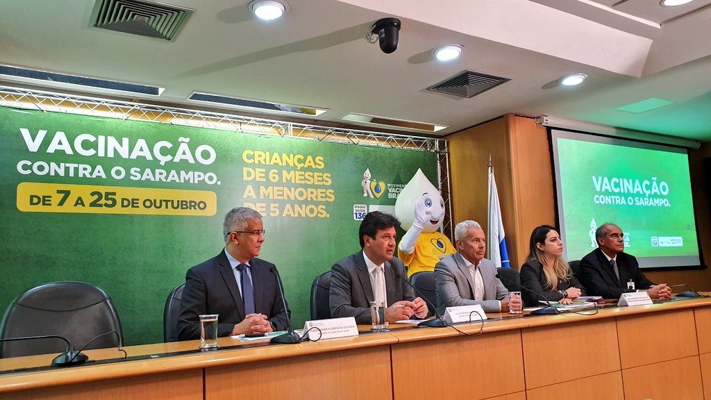 Primeira fase da campanha começa na próxima segunda (7) e vai até 25 de outubro, com a meta de vacinar pelo menos 95% das crianças de seis meses a 5 anos em todo o país. O ministro da Saúde, Luiz Henrique Mandetta (segundo da esquerda para a direita) participou do lançamento da campanha nacional de vacionação contra o sarampo nesta sexta-feira (4), em Brasília Divulgação/Ministério da Saúde O governo federal lançou na tarde desta sexta-feira (4) uma campanha nacional de vacinação contra o sarampo, e disse que vai distribuir "incentivo" financeiro de R$ 206 milhões aos estados que cumprirem metas de cobertura da vacina. Em entrevista a jornalistas em Brasília, o Ministério da Saúde afirmou que, no período de 90 dias até 28 de setembro, o Brasil registrou 5.504 casos confirmados da doença. O valor do incentivo será pago em uma única parcela, e o valor total de R$ 206 milhões será dividido de acordo com a população de cada estado, fazendo o cálculo de R$ 1 por pessoa. Além disso, R$ 333 milhões serão repassados para reforçar as equipes locais de profissionais de saúde, e outros R$ 19 milhões serão gastos na veiculação, na TV, internet, cinemas e outras mídias, de um comunicado informando sobre a necessidade de vacinar a população, principalmente os bebês. "Vacina é um direito da criança", afirmou o ministro da Saúde, Luiz Henrique Mandetta. "A criança não consegue ir sozinha numa unidade de saúde para reivindicar seu direito. Pais, responsáveis, madrinhas: chequem a carteira de vacinação em respeito à criança, em amor. Se estiver incompleta, vá ao posto de saúde tomar a segunda dose." Realizada em caráter nacional, a campanha será realizada em diversas fases, cada uma destinada a uma faixa etária: Campanha de vacinação contra o sarampo: 7 a 25 de outubro: crianças de seis meses a 5 anos de idade (o "Dia D" da campanha acontece em 19 de outubro) 18 a 30 de novembro: jovens de 20 a 29 anos (o "Dia D" será em 30 de novembro) As etapas de 2020 terão como público-alvo as crianças de 6 a 19 anos, os adultos de 30 a 49 anos e os de 50 a 59 anos "No próximo ano nós complementaremos com a fase de 6 anos a 19 anos, de 30 a 49 anos, e a última fase de 50 a 59 anos", explicou Wanderson Kleber, secretário de Vigilância em Saúde do ministério. "Então teremos aí uma ação bastante ampla para atingir toda a população brasileira", continuou ele, explicando que o objetivo é "eliminar a circulação desse vírus e garantir altas coberturas vacinais, que vão proteger não só contra o sarampo, porque a vacina ou vai ser tríplice viral, ou dupla viral, vai proteger contra o sarampo e também a rubéola".