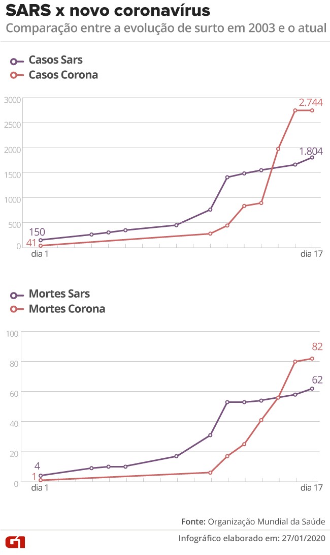 Dados da OMS mostram que número de casos e mortes se intensificou no 15º dia após o começo dos registros. Nas primeiras duas semanas de surto, os casos do novo coronavírus 2019-nCoV superam os da epidemia SARS-CoV, de acordo com dados a Organização Mundial da Saúde (OMS). A versão mais antiga do vírus causou um surto na China entre 2002 e 2003, com mais de 900 mortes e dezenas de países afetados. Até a manhã de terça-feira (28) a China atualizou o número de mortes para 106, além do governo chinês ter confirmado 4.515 casos da doença 18 dias depois da primeira morte. Evolução dos casos do SARS-nCoV e 2019-nCoV Betta Jaworski/Arte G1 Os casos do novo vírus dispararam na última semana - foram de 444 em 11 de janeiro para 4,5 mil nesta terça. Na segunda-feira (27), a Organização Mundial da Saúde (OMS) recuou e mudou a avaliação de risco internacional para elevada. Inicialmente, após reunião dos líderes do comitê de emergência na quarta-feira (22) e na quinta-feira (23), a OMS havia dito que "ainda é cedo" para declarar emergência internacional e avaliou o surto como uma epidemia apenas na China. Em relatórios anteriores, o órgão das Nações Unidas apontou que o risco global era "moderado". "Foi um erro de formulação nos relatórios de 23, 24 e 25 de janeiro, e nós o corrigimos", explicou uma porta-voz da instituição com sede em Genebra. OMS aumenta o risco internacional do coronavírus para ‘elevado’ 15 países Neste novo surto em 2019, que iniciou no final de dezembro, 14 países foram afetados além da China: Tailândia, Austrália, Malásia, Singapura, França, Japão, Coreia do Sul, Estados Unidos, Vietnã, Arábia Saudita, Nepal e Canadá. Ao todo, do primeiro ao último caso, o SARS-CoV atingiu 30 países em cerca de 6 meses. Em 2003, um caso importado chegou a ser confirmado em uma menina de 4 anos no Brasil. China, Canadá, Malásia, Filipinas, Sinagapura, Tailândia e Vietnã registraram os mortos pela infecção do SARS. Ainda sobre o caso do antigo SARS-CoV, de acordo com documentos da OMS, os primeiros registros mostram que 90% das infecções começaram por profissionais de saúde. Ciclo do novo coronavírus - transmissão e sintomas Aparecido Gonçalves/Arte G1 Transmissão do vírus O ministro da Comissão Nacional de Saúde da China, Ma Xiaowei, disse neste domingo (26) que o novo coronavírus pode se espalhar antes mesmo do aparecimento de sintomas. Ma afirmou ainda que a capacidade de transmissão do coronavírus está se fortalecendo e reforçou as ações de contenção, que até agora incluem restrições de transporte e viagens e o cancelamento de grandes eventos, serão intensificados. Vacinas contra o vírus Um grupo de cientistas do Instituto Nacional de Saúde dos Estados Unidos (NIH, na sigla em inglês) deverá testar vacinas contra o coronavírus em humanos em até três meses, de acordo com a agência de notícias Reuters. A vacina será desenvolvida a partir do código genético desta nova mutação do coronavírus, conhecida como 2019-nCOV. A OMS pediu a cientistas de todo o mundo que estejam estudando o novo coronavírus compartilhem suas descobertas com a instituição mesmo sem a publicação oficial em periódicos oficiais. A Coalizão de Inovações em Preparação para Epidemias (Cepi) – grupo internacional para o controle de doenças – anunciou em 22 de janeiro um fundo para apoiar três programas de desenvolvimento de vacinas contra o 2019-nCoV, o novo coronavírus. A Rússia, por meio de seu órgão regulador, também havia anunciado que está trabalhando no desenvolvimento de uma vacina contra o coronavírus. Raio X do novo coronavírus Amanda Paes e Cido Gonçalves/Arte G1 Clima de incerteza por causa do coronavírus derruba Bolsas de Valores Initial plugin text