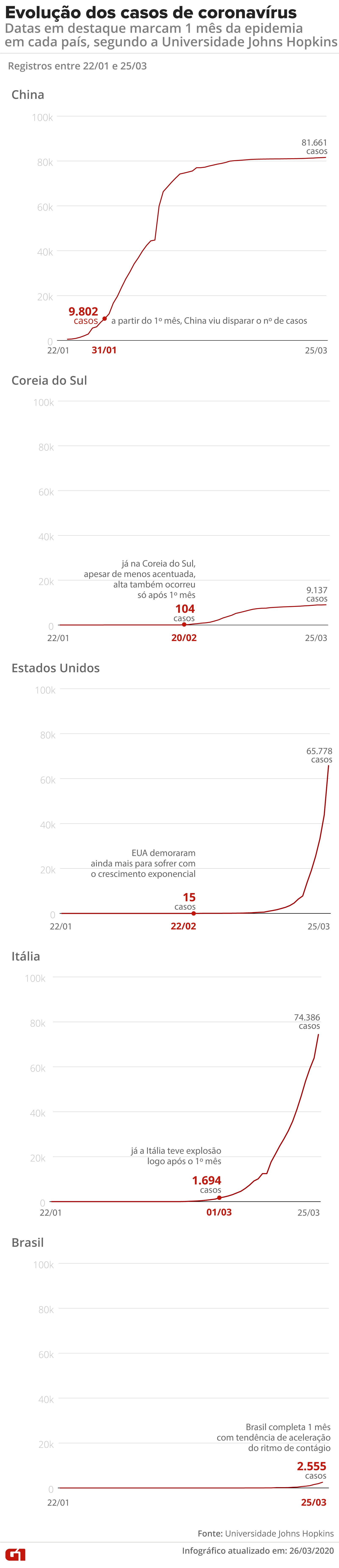 Confirmação do primeiro caso da doença Covid-19 no Brasil completa um mês nesta quinta-feira (26). Tendência no exterior mostra que ritmo de contágio ocorre em momento posterior aos primeiros 30 dias. A confirmação do primeiro caso do novo coronavírus (Sars-CoV-2) no Brasil completa um mês nesta quinta-feira (26). Desde aquele registro inicial, o país chegou a mais de 2,5 mil infectados e ultrapassou a marca de 60 mortos, de acordo com as secretarias estaduais de Saúde. O primeiro óbito foi contabilizado em 17 de março. No dia anterior, Estados como Rio de Janeiro e São Paulo haviam adotado restrição de serviços e de circulação de pessoas para tentar conter a pandemia da Covid-19. Naquela semana, tais medidas já haviam sido adotadas, em maior ou menor grau, em outros países largamente afetados: China – onde Covid-19 surgiu (o país enviou alerta à OMS em 31 de dezembro) Coreia do Sul – registrou os primeiros casos em 20 de janeiro e é considerada bom exemplo na contenção da Covid-19 Estados Unidos – registraram o primeiro caso em 22 de janeiro e os casos só dispararam em março. Agora, o país se prepara para um "cenário sombrio", segundo especialistas Itália – registrou os primeiros casos em 31 de janeiro e agora soma mais de 7,5 mil mortes (maior registro de óbitos do mundo) Em nenhum desses países, o pico de contágio ocorreu antes que se completasse um mês de coronavírus. Veja a tabela abaixo: Evolução do coronavírus nos países Os números de cada um mostram que, apesar de haver algumas variações de cenário, a tendência é que a "explosão" de infecções se verifique apenas em um período posterior aos primeiros 30 dias. O infográfico abaixo mostra um comparativo dos 30 dias inicias de coronavírus no Brasil com o período correspondente na China, Coreia do Sul, Estados Unidos e Itália. Considerando esses quatro países, o Brasil perde apenas para a China no número de infectados um mês após o registro do primeiro caso. Os dados são da Universidade Johns Hopkins, nos Estados Unidos, que fornece registros a partir de 22 de janeiro. Veja, abaixo, os marcos do primeiro mês de Covid-19 em cada país: Evolução dos casos de Covid-19 nos primeiros 30 dias na China, na Itália, na Coreia do Sul, nos EUA e no Brasil Arte/G1 China 31 de dezembro: país envia um alerta à Organização Mundial de Saúde (OMS) relatando uma pneumonia de causa desconhecida 22 de janeiro: Wuhan, epicentro do coronavírus na China, é isolada e tem transporte público, trens e voos cancelados 23 de janeiro: China bloqueia transporte entre cidades próximas ao centro da epidemia de coronavírus 24 de janeiro: a quarentena chega a 40 milhões de pessoas (a província de Hubei, onde fica Wuhan, tem quase 60 milhões de habitantes) 30 de janeiro: o presidente chinês, Xi Jinping, coloca o país inteiro em restrição de viagens 31 de janeiro: a China completa 1 mês após os primeiros registros oficiais do novo coronavírus e tem 9.802 casos confirmados de Covid-19 e 213 mortes, segundo o levantamento da Universidade Johns Hopkins e a OMS. A taxa de mortalidade é de 2,2% Coreia do Sul 20 de janeiro: registra o primeiro caso do novo coronavírus Ainda no início do surto: governo sul-coreano começa a rastrear os possíveis focos de transmissão no país, com monitoramento de casos suspeitos; também estabelece quarentena para todas as pessoas que chegam de Wuhan, na China Outras medidas: testes em massa da população; isolamento de infectados; rastreamento de suspeitos por imagens de videovigilância, cartão de crédito ou celular; envio de SMS à população da área perto de onde é confirmado um caso; incentivo a home office; limpeza e desinfecção de algumas das principais estações de metrô 3 de fevereiro: mais de 300 escolas na Coreia do Sul adiam o retorno às aulas (apenas das áreas com casos confirmados de Covid-19) 19 de fevereiro: autoridades identifica que o número de casos de Covid-19 explodiu porque uma pessoa infectada participou de um evento religioso. A cidade de Daegu entra em quarentena, afetando 2,5 milhões de pessoas 20 de fevereiro: a Coreia do Sul completa 1 mês do primeiro registro do novo coronavírus e tem 104 casos confirmados de Covid-19 e uma morte, segundo a Universidade Johns Hopkins e a OMS. A taxa de mortalidade é de 0,9% Estados Unidos 22 de janeiro: país registra o primeiro caso do novo coronavírus Primeiras semanas: os EUA mantiveram quarentena apenas para repatriados, como as pessoas retiradas de Wuhan, na China, e as saídas de um navio de cruzeiro do Japão 22 de fevereiro: os Estados Unidos completam 1 mês do primeiro registro do novo coronavírus e tem 15 casos confirmados de Covid-19 nenhuma morte, segundo a Universidade Johns Hopkins e a OMS. Itália 31 de janeiro: país registra os dois primeiros casos; no mesmo dia, o governo suspende os voos com origem e destino da China 21 de fevereiro: Itália confirma sua 1ª morte por Covid-19; país totaliza 17 casos da doença 22 de fevereiro: governo declara toque de recolher na Lombardia, região que fica ao norte do país e é a mais afetada pelo surto; medida afeta 11 cidades e população em torno de 50 mil pessoas 24 de fevereiro: primeiro-ministro Giuseppe Conte suspende decreto do governador da região de Marche que previa fechamento de escolas e proibia aglomerações; o premiê italiano argumentou que esse tipo de ação descentralizada "contribuía para gerar o caos". Na mesma época, o governador da Lombardia decreta o fechamento de bares e restaurantes, medida também anulada pelo governo central de Roma 1º de março: Itália completa 1 mês dos primeiros registros do novo coronavírus e tem 1.694 casos e 29 mortes, segundo a Universidade Johns Hopkins e a OMS. A taxa de mortalidade é de 2,6% Foi apenas em 8 de março que a Itália decidiu isolar toda a região da Lombardia, responsável por parte importante da economia do país, em uma medida que a