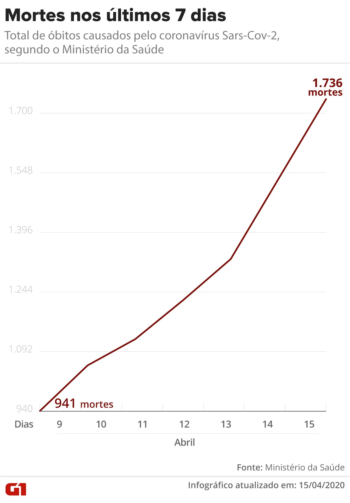 Pelo segundo dia consecutivo, número de novas mortes confirmadas passa de 200. Mortes por Covid-19 nos últimos 7 dias no Brasil Arte/G1 O Ministério da Saúde divulgou nesta quarta-feira (15) o mais recente balanço dos casos de coronavírus no Brasil. Os principais dados são: 1.736 mortes, eram 1.532 na terça, aumento de 13% 28.320 casos confirmados, eram 25.262, aumento de 12% São Paulo tem 778 mortes e 11.043 casos confirmados Em 7 dias, total de mortes subiu 84% Covid-19 pressiona sistema de saúde Mortes por Covid-19 no Brasil até 15/04 Arte/G1 ATENDIMENTO: Leitos de UTI em SP começam a lotar a partir de maio, diz secretário RIO DE JANEIRO: Famílias de pacientes mortos têm dificuldade para localizar corpos FLORIANÓPOLIS: SC começa a testar casos suspeitos de coronavírus em 'drive-thru' Coronavírus: casos e mortes em 15/04 Arte/G1 Estados com mais mortes confirmadas são: São Paulo (778), Rio de Janeiro (265), Pernambuco (143), Ceará (116) e Amazonas (106). Initial plugin text