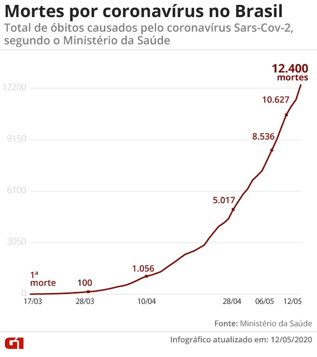 Em 24 horas, foram confirmadas mais 881 novas mortes, sendo que 206 ocorreram nos últimos três dias. Foram 881 mortes registradas pelo Ministério da Saúde nas últimas 24 horas Aparecido Gonçalves/ G1 O Ministério da Saúde divulgou nesta terça-feira (12) o mais recente balanço dos casos de novo coronavírus no Brasil. Os principais dados são: 12.400 mortes, eram 11.519 na segunda-feira (11) Foram mais 881 novos registros de mortes acrescentados em 24 horas 177.589 casos confirmados, eram 168.331 na segunda-feira (11) Foram 9.258 casos incluídos no balanço em 24 horas Foram 9.258 novos casos registrados nas últimas 24 horas Aparecido Gonçalves/ G1 Balanço dos casos e mortes por Covid-19 em 12-05 Reprodução/Ministério da Saúde Recuperados e em acompanhamento De acordo com o Ministério da Saúde, há 92.593 pacientes em acompanhamento (52,1% dos casos) e outros 72.597 já recuperados (40,9%). Dos 881 óbitos incluídos no balanço nesta terça-feira (12), 206 ocorreram nos últimos três dias. Há ainda outras 2.050 mortes em investigação. Nesta terça, o ministério informou que 93 profissionais de saúde foram hospitalizados com a Covid-19. E também apontou que apura se Brasil teve 39 infectados pelo coronavírus antes da confirmação do 1º caso em 26 de fevereiro. Após buscar solução nacional para falta de respiradores, ministério recebe só 22% dos equipamentos previstos para abril Máscaras contra o coronavírus: guia definitivo mostra como montar, usar, lavar e descartar Initial plugin text