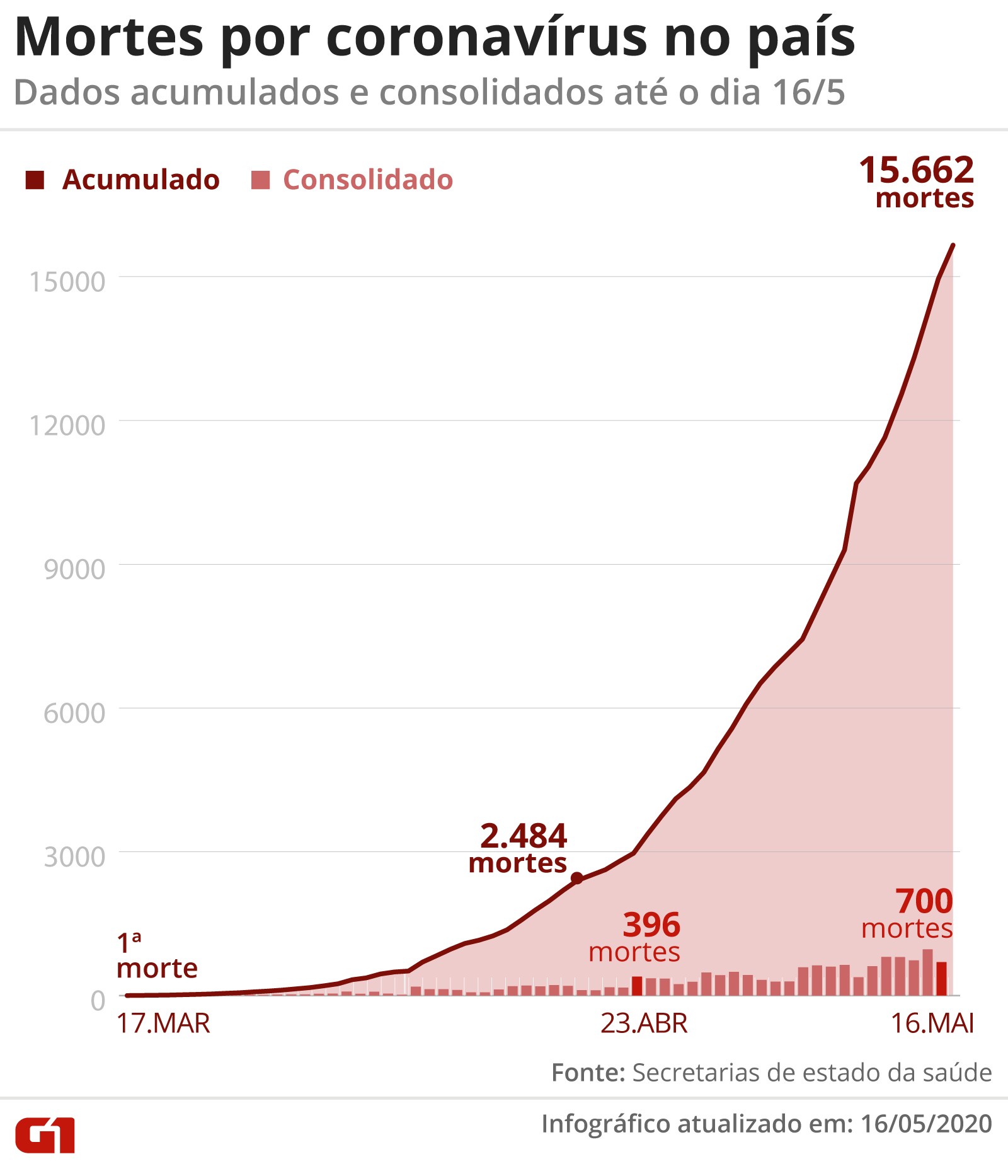 As secretarias estaduais de Saúde confirmam no país 233.648 casos do novo coronavírus (Sars-CoV-2), com 15.668 mortes. Veja os dados sobre o coronavírus no Brasil neste domingo (17), segundo levantamento exclusivo do G1 junto às secretarias estaduais de saúde. Foram registradas 15.668 mortes provocadas pela Covid-19 e 233.648 casos confirmados da doença em todo o país. O balanço do Ministério da Saúde divulgado neste sábado (16) informa 15.633 mortos e 233.142 casos. Consulte aqui quantos casos e mortes há em sua cidade. Mortes por coronavírus no país Arte G1 As 20 cidades com maior mortalidade e incidência de casos estão no Norte e Nordeste. Veja gráficos: Taxa de ocupação de leitos de UTI Acre – 23,3% em todo o estado em 28/4 Alagoas – 67% em todo o estado da rede pública e contratualizados em 15/5 Amazonas – 86% em todo o estado em 14/5 Bahia – 51,20% em todo o estado em 14/5 Ceará – 90% em todo o estado em 2/5 Espírito Santo - 62,93% em todo o estado em 6/5 Maranhão – 96,02% na capital em 15/5 Mato Grosso – 9,6% dos leitos de UTI da rede pública em todo o estado em 6/5 Mato Grosso do Sul – 1,70% em todo o estado em 14/5 Minas Gerais – 59% em todo o estado em 5/5 Pará – 86.74% em todo o estado em 13/5 Paraíba – 60% em todo o estado em 13/5 Paraná – 45,50% em todo o estado em 16/5 Piauí - 46,20% em todo o estado em 13/5 Pernambuco –52,20% em todo o estado em 7/5 Rio de Janeiro – 98% em todo o estado em 4/5 Rio Grande do Norte – 33% em todo o estado em 22/4 Rio Grande do Sul – 74,10% em todo o estado em 13/5 Rondônia – 31,60% em todo o estado em 11/05 Santa Catarina – 22,80% do sistema público em todo o estado em 16/5 São Paulo – 68,50% em todo o estado em 16/5 Sergipe – 56,30% do sistema público em todo o estado em 13/5 Tocantins – 35% dos leitos ocupados em 8/5 Amapá, Distrito Federal, Goiás e Roraima não divulgaram a taxa de ocupação. Coronavírus: Conversar com máscara é mais seguro Testes feitos pelos estados Número de testes de coronavírus feitos pelos estados Paraíba, Rio de Janeiro e Rio Grande do Sul não divulgaram o número de testes. Pacientes recuperados Pacientes recuperados de Covid-19 nos estados Goiás e São Paulo não divulgaram o número de pacientes recuperados. Entenda algumas das expressões mais usadas na pandemia do covid-19 Initial plugin text