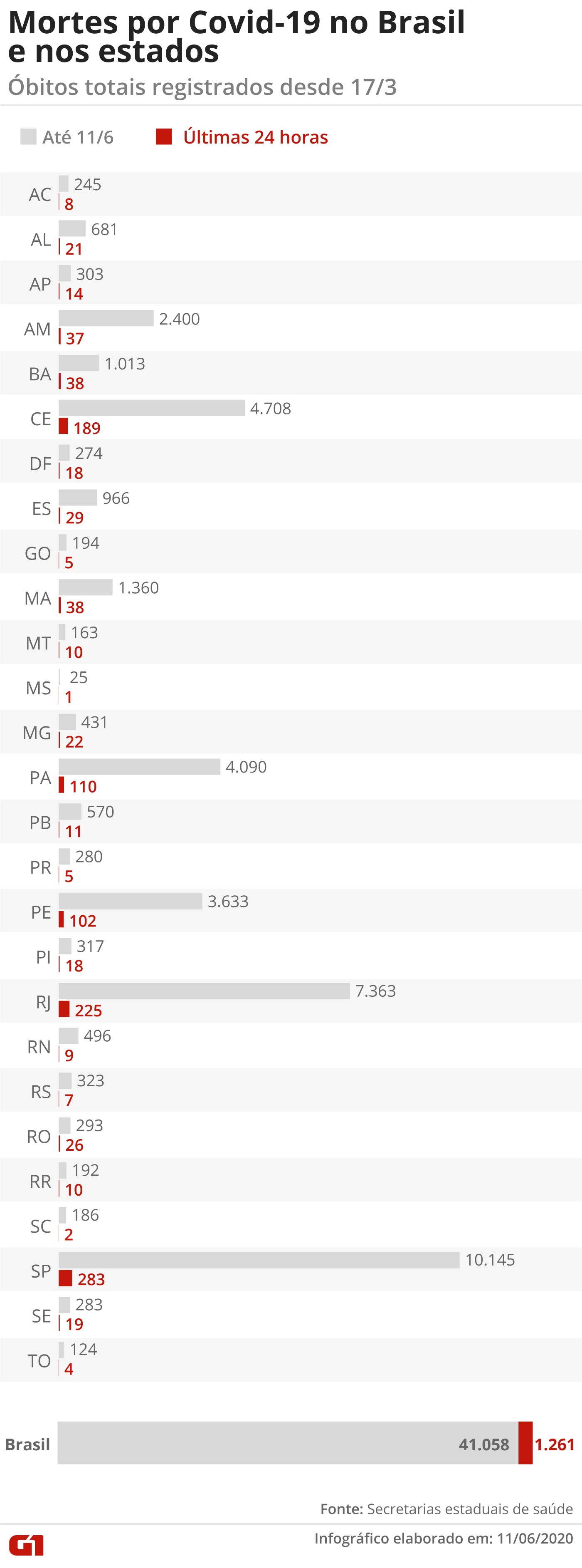 Levantamento feito por jornalistas de G1, O Globo, Extra, Estadão, Folha e UOL junto às secretarias estaduais de Saúde mostra ainda que houve 30.465 novos casos de Covid-19 em um dia; são 805.649 no total. O Brasil teve 1.261 novas mortes registradas em razão do novo coronavírus nas últimas 24 horas, aponta levantamento feito pelo consórcio de veículos de imprensa junto às secretarias estaduais de Saúde. Com isso, são 41.058 óbitos pela Covid-19 no país até esta quinta-feira (11). Veja os dados, consolidados às 20h: 41.058 mortes ; eram 39.797 até as 20h de quarta-feira (10), uma diferença de 1.261 óbitos 805.649 casos confirmados; eram 775.184 até a noite de quarta Os dados foram obtidos após uma parceria inédita entre G1, O Globo, Extra, O Estado de S.Paulo, Folha de S.Paulo e UOL, que passaram a trabalhar de forma colaborativa para reunir as informações necessárias nos 26 estados e no Distrito Federal. O objetivo é que os brasileiros possam saber como está a evolução e o total de óbitos provocados pela Covid-19, além dos números consolidados de casos testados e com resultado positivo para o novo coronavírus. Pelo terceiro dia consecutivo, houve mais de mil mortes e mais de 30 mil novos casos em um intervalo de um dia. O Nordeste tem mais casos que o Sudeste. São 285 mil casos confirmados nos nove estados, contra 281 mil em Minas Gerais, Espírito Santo, Rio de Janeiro e São Paulo. Levantamento mostra mortes por Covid-19 no Brasil Guilherme Gomes/G1 EXCLUSIVO G1: Veja taxa de ocupação nas UTIs, número de testes e pacientes recuperados da Covid-19 nos estados Parceria A parceria entre os veículos de comunicação foi feita em resposta à decisão do governo Jair Bolsonaro de restringir o acesso a dados sobre a pandemia de Covid-19. Personalidades do mundo político e jurídico, juntamente com entidades representativas de profissionais e da imprensa, elogiaram a iniciativa. Mudanças feitas pelo Ministério da Saúde na publicação de seu balanço da pandemia reduziram por alguns dias a quantidade e a qualidade dos dados. Primeiro, o horário de divulgação, que era às 17h na gestão do ministro Luiz Henrique Mandetta (até 17 de abril), passou para as 19h e depois para as 22h. Isso dificultou ou inviabilizou a publicação dos dados em telejornais e veículos impressos. “Acabou matéria no Jornal Nacional”, disse o presidente Jair Bolsonaro, em tom de deboche, ao comentar a mudança. A segunda alteração foi de caráter qualitativo. O portal no qual o ministério divulga o número de mortos e contaminados foi retirado do ar na noite da última quinta-feira (4). Quando retornou, depois de mais de 19 horas, passou a apresentar apenas informações sobre os casos “novos”, ou seja, registrados no próprio dia. Desapareceram os números consolidados e o histórico da doença desde seu começo. Também foram eliminados do site os links para downloads de dados em formato de tabela, essenciais para análises de pesquisadores e jornalistas, e que alimentavam outras iniciativas de divulgação. Entre os itens que deixaram de ser publicados estão: curva de casos novos por data de notificação e por semana epidemiológica; casos acumulados por data de notificação e por semana epidemiológica; mortes por data de notificação e por semana epidemiológica; e óbitos acumulados por data de notificação e por semana epidemiológica. Neste domingo (7), o governo anunciou que voltaria a informar seus balanços sobre a doença. Mas mostrou números conflitantes, divulgados no intervalo de poucas horas. Nesta quinta (11), o Ministério da Saúde divulgou os dados completos, obedecendo a ordem do STF. Segundo a pasta, houve 1.239 novos óbitos e 30.412 novos casos, somando 40.919 mortes e 802.828 casos desde o começo da pandemia – números menores que os apurados pelo consórcio. Initial plugin text