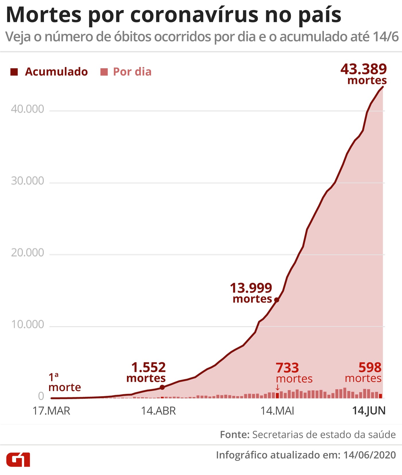 Levantamento feito por jornalistas de G1, O Globo, Extra, Estadão, Folha e UOL junto às secretarias estaduais de Saúde mostra ainda que houve 17.086 novos casos de Covid-19 em um dia. São 867.882 no total. Brasil tem 43.389 mortes por Covid, aponta consórcio de veículos de imprensa O Brasil teve 598 novas mortes registradas em razão do novo coronavírus nas últimas 24 horas, aponta levantamento feito pelo consórcio de veículos de imprensa junto às secretarias estaduais de Saúde. Com isso, são 43.389 óbitos pela Covid-19 até este domingo (14). Veja os dados, consolidados às 20h: 43.389 mortes; eram 42.791 até as 20h de sábado (13), uma diferença de 598 óbitos 867.882 casos confirmados; eram 850.796 até a noite de sábado Apenas o Rio Grande do Norte não divulgou novos dados; o estado diz que não publica boletins aos domingos. Os dados foram obtidos após uma parceria inédita entre G1, O Globo, Extra, O Estado de S.Paulo, Folha de S.Paulo e UOL, que passaram a trabalhar de forma colaborativa para reunir as informações necessárias nos 26 estados e no Distrito Federal. O objetivo é que os brasileiros possam saber como está a evolução e o total de óbitos provocados pela Covid-19, além dos números consolidados de casos testados e com resultado positivo para o novo coronavírus. O Brasil é o segundo país com mais casos e mais mortes no mundo, somente atrás dos EUA. O país concentra 10% de todas as vítimas do planeta, de acordo com dados compilados pela Universidade Johns Hopkins. Já os Estados Unidos têm 2 milhões de casos. São 115 mil óbitos. Editoria de Arte/G1 Editoria de Arte/G1 EXCLUSIVO G1: Veja taxa de ocupação nas UTIs, número de testes e pacientes recuperados da Covid-19 nos estados Parceria A parceria entre os veículos de comunicação foi feita em resposta à decisão do governo Jair Bolsonaro de restringir o acesso a dados sobre a pandemia da Covid-19. Personalidades do mundo político e jurídico, juntamente com entidades representativas de profissionais e da imprensa, elogiaram a iniciativa. Mudanças feitas pelo Ministério da Saúde na publicação de seu balanço da pandemia reduziram por alguns dias a quantidade e a qualidade dos dados. Primeiro, o horário de divulgação, que era às 17h na gestão do ministro Luiz Henrique Mandetta (até 17 de abril), passou para as 19h e depois para as 22h. Isso dificultou ou inviabilizou a publicação dos dados em telejornais e veículos impressos. “Acabou matéria no Jornal Nacional”, disse o presidente Jair Bolsonaro, em tom de deboche, ao comentar a mudança. A segunda alteração foi de caráter qualitativo. O portal no qual o ministério divulga o número de mortos e contaminados foi retirado do ar na noite da quinta-feira (4). Quando retornou, depois de mais de 19 horas, passou a apresentar apenas informações sobre os casos “novos”, ou seja, registrados no próprio dia. Desapareceram os números consolidados e o histórico da doença desde seu começo. Também foram eliminados do site os links para downloads de dados em formato de tabela, essenciais para análises de pesquisadores e jornalistas, e que alimentavam outras iniciativas de divulgação. Entre os itens que deixaram de ser publicados estão: curva de casos novos por data de notificação e por semana epidemiológica; casos acumulados por data de notificação e por semana epidemiológica; mortes por data de notificação e por semana epidemiológica; e óbitos acumulados por data de notificação e por semana epidemiológica. No domingo (7), o governo anunciou que voltaria a informar seus balanços sobre a doença. Mas mostrou números conflitantes, divulgados no intervalo de poucas horas. Apenas na terça (9) o ministério voltou a divulgar os dados completos, obedecendo a ordem do STF. Neste domingo (14), o órgão publicou um novo balanço. Segundo a pasta, houve 612 novos óbitos e 17.110 novos casos, somando 43.332 mortes e 867.624 casos desde o começo da pandemia – números totais menores que os apurados pelo consórcio. Initial plugin text